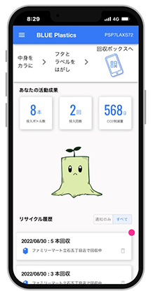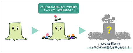 アプリにペットボトル回収の登録を行った日数に応じて、切り株の妖精をイメージしたオリジナルキャラクターが成長し、お花を咲かせます。どんどん成長させて、キャラクターの変化をお楽しみください。