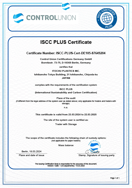 2021年3月よりマスバランス認証であるISCC PLUS認証を取得し、ISCCの要求事項を遵守して認証運用を継続実施中。